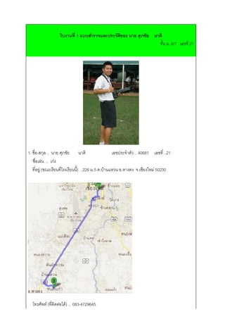 นาย ศุภชัย นาติ ิ ชั้น ม. 6/7 เลขที่ 21 1. ชื่อ-สกุล .. นาย ศุภชัย นาติ เลขประจาตัว .. 40681 เลขที่ ..21 ชื่อเล่น .. เก่ง ที่อยู่ (ขณะเรียนที่โรงเรียนนี้) ..226 ม.5 ต.บ้านแหวน อ.หางดง จ.เชียงใหม่ 50230 โทรศัพท์ (ที่ติดต่อได้) .. 083-4729645