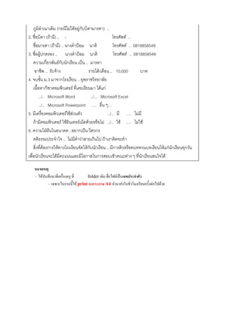 ชื่อบิดา (ถ้ามี) .. - โทรศัพท์ .. ชื่อมารดา (ถ้ามี) .. นางคาป้อม นาติ โทรศัพท์ .. 0818858549 3. ชื่อผู้ปกครอง .. นางคาป้อม นาติ โทรศัพท์ .. 0818858549 ความเกี่ยวพันธ์กับนักเรียน เป็น .. มารดา อาชีพ .. รับจ้าง รายได้/เดือน .. 10,000 บาท 4. จบชั้น ม.3 มาจากโรงเรียน .. ยุพราชวิทยาลัย เนื้อหา/วิชาคอมพิวเตอร์ ที่เคยเรียนมา ได้แก่ ../.. Microsoft Word ../... Microsoft Excel ../.. Microsoft Powerpoint …. อื่น ๆ .. 5. มีเครื่องคอมพิวเตอร์ใช้ส่วนตัว ../.. มี …. ไม่มี ถ้ามีคอมพิวเตอร์ ใช้อินเทอร์เน็ตด้วยหรือไม่ ../.. ใช้ …. ไม่ใช้ 6. ความใฝ่ฝันในอนาคต ..อยากเป็น วิศวกร คติธรรมประจาใจ .. ไม่มีคาว่าสายเกินไป ถ้าเราคิดจะทา สิ่งที่ต้องการให้ทางโรงเรียนจัดให้กับนักเรียน .. มีการติวหรือทบททวนบทเรียนให้แก่นักเรียนทุกวัน เพื่อนักเรียนจะได้มีคะแนนและมีโอกาสในการสอบเข้าคณะต่าง ๆ ที่นักเรียนสนใจได้ หมายเหตุ - ให้บันทึกมาที่เครื่องครู ที่ folder เดิม ชื่อไฟล์เป็นเลขประจาตัว - เฉพาะใบงานนี้ให้ print ลงกระดาษ A4 นามาส่งในชั่วโมงเรียนครั้งต่อไปด้วย