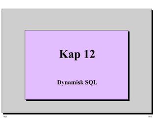 This document describes dynamic SQL and classes used in a client/server database application. It discusses how dynamic SQL statements are generated at runtime based on form controls and table names. Various classes are shown like clsSqlDbAccess for database access, clsWnd for windows, clsMdi for MDI forms, and clsTbl for tables. Methods are described for generating SQL statements, executing queries, and handling results based on messages between classes.