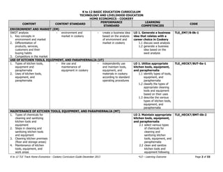 The document is a curriculum guide for a Grade 9 Cookery course in the Philippines. It covers the following key points: