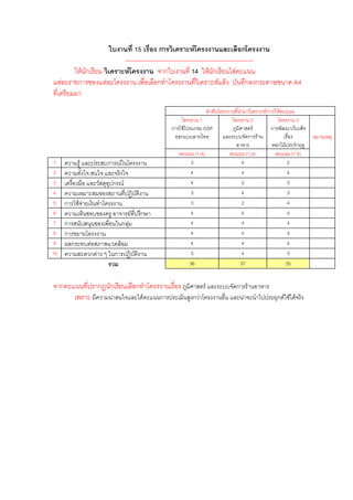 การวิเคราะหโครงงานและเลือกโครงงาน -------------------------------------------------------------- ใหนักเรียน วิเคราะหโครงงาน จากใบงานที่ 14 ใหนักเรียนใสคะแนน แตละรายการของแตละโครงงาน เพื่อเลือกทําโครงงานที่วิเคราะหแลว บันทึกลงกระดาษขนาด A4 ที่เตรียมมา ลําดับโครงงานที่นํามาวิเคราะห/การใหคะแนน โครงงาน 1 โครงงาน 2 โครงงาน 3 การใชโปรแกรม GSP ภูมิศาสตร การพัฒนาเว็บเพ็จ ออกแบบลายไทย และระบบจัดการราน เรื่อง หมายเหตุ อาหาร ดอกไมประจําฤดู คะแนน (1-4) คะแนน (1-4) คะแนน (1-4) 1 ความรู และประสบการณในโครงงาน 3 4 2 2 ความตั้งใจ สนใจ และจริงใจ 4 4 4 3 เครื่องมือ และวัสดุอุปกรณ 4 3 3 4 ความเหมาะสมของสถานที่ปฏิบัติงาน 3 4 3 5 การใชจายเงินทําโครงงาน 3 2 4 6 ความเห็นชอบของครู อาจารยที่ปรึกษา 4 4 4 7 การสนับสนุนของเพื่อนในกลุม 4 4 4 8 การขยายโครงงาน 4 4 4 9 ผลกระทบตอสภาพแวดลอม 4 4 4 10 ความสะดวกตาง ๆ ในการปฏิบัติงาน 3 4 3 รวม 36 37 35 จากคะแนนที่ปรากฏนักเรียนเลือกทําโครงงานเรื่อง ภูมิศาสตร และระบบจัดการรานอาหาร เพราะ มีความนาสนใจและไดคะแนนการประเมินสูงกวาโครงงานอื่น และนาจะนําไปประยุกตใชไดจริง