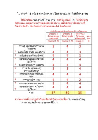 ใส่คะแนน แต่ละรายการของแต่ละโครงงาน เพื่อเลือกทำาโครงงานที่