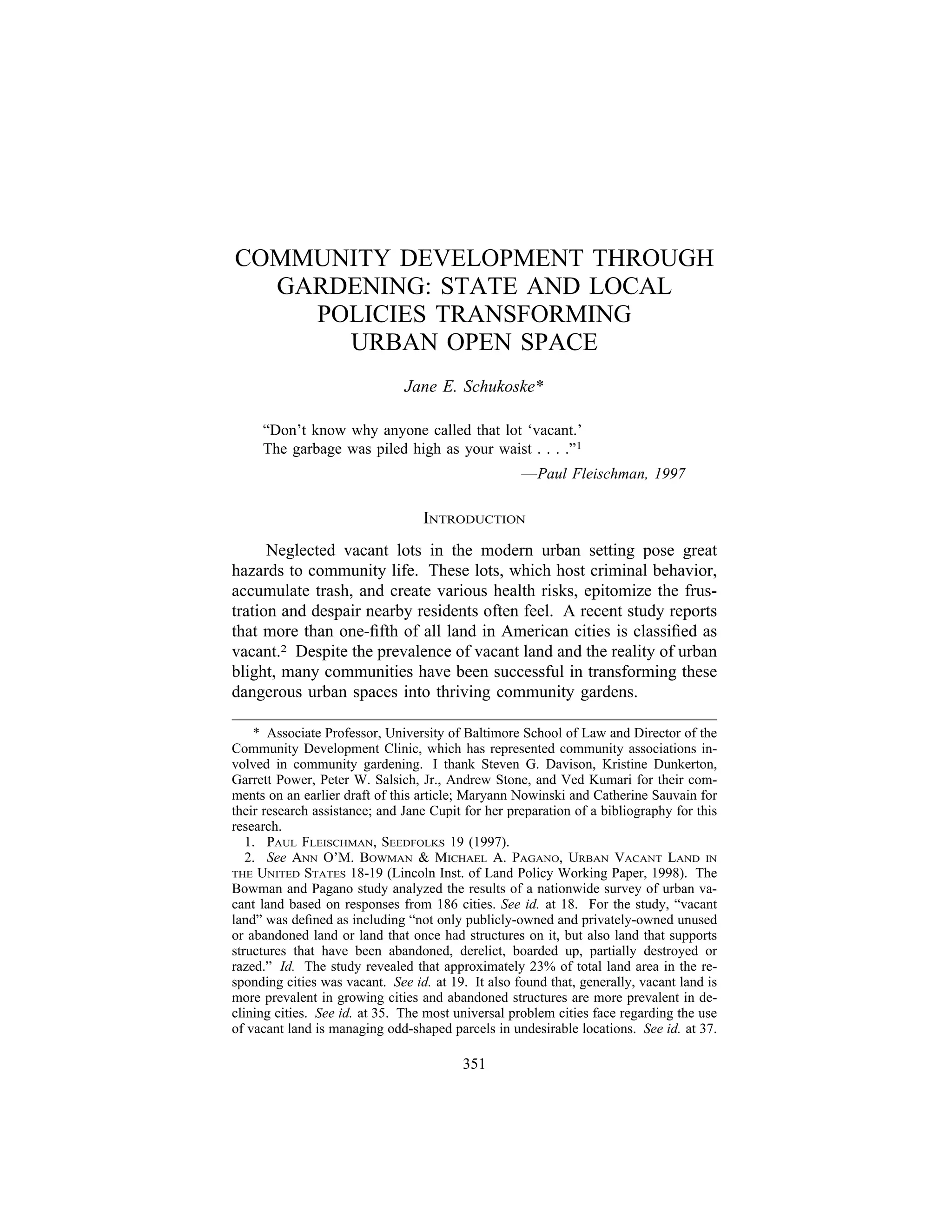 This document discusses how community gardens have transformed vacant urban lots and fostered community development. It notes that over 20% of land in American cities is vacant, posing health and safety risks. Community gardens have helped beautify neighborhoods and build community spirit. However, the permanence of gardens is uncertain. The document examines issues facing urban gardens and policies that could support their growth and protect them.