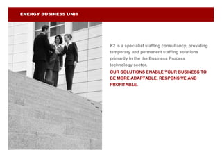 K2 is a specialist staffing consultancy that provides temporary and permanent staffing solutions, primarily in business process technology. They focus on staffing for the energy and utility industries. K2 has experience staffing projects involving SAP, Oracle, and other technologies for energy companies around the world. They ensure clients receive consultants with both technical skills and industry expertise to address their specific business needs.