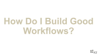 The document provides insights into building effective workflows, emphasizing best practices such as clean design layouts, externalizing data, and limiting process size. It discusses common pitfalls like large log files and performance issues, suggesting methods for handling them, as well as the shift from InfoPath to SmartForms for attachments. Additionally, it includes guidance on SQL server broker management and offers PowerShell examples for K2 process management.