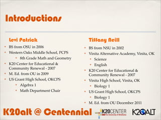 This document introduces Tiffany Neill and Levi Patrick, who both have backgrounds in education. They discuss their educational experiences and goals for their presentation at Centennial. The presentation includes discussions on famine in Africa, vertical farming, authentic instruction, and using technology to illuminate the curriculum. They encourage attendees to contact them if they would like support focusing on specific strategies or practices.