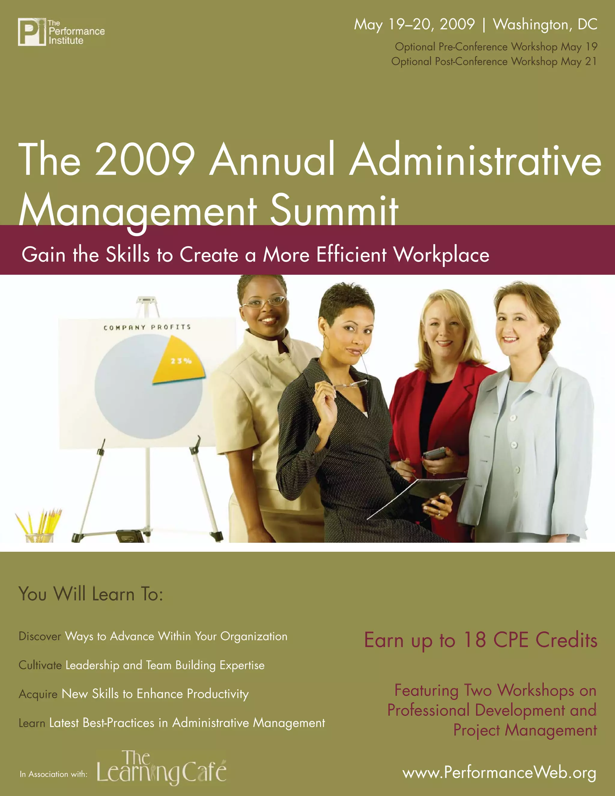 The document provides information about the 2009 Annual Administrative Management Summit. The summit will take place from May 19-21, 2009 in Washington, DC and include optional pre-conference and post-conference workshops. Attendees will learn skills to improve productivity, communication, stress management, leadership, and more. Speakers will provide training on topics like professional development, negotiating, project management, and mentoring. The event will take place at the Performance Institute Training Center and rooms have been reserved at a nearby hotel.
