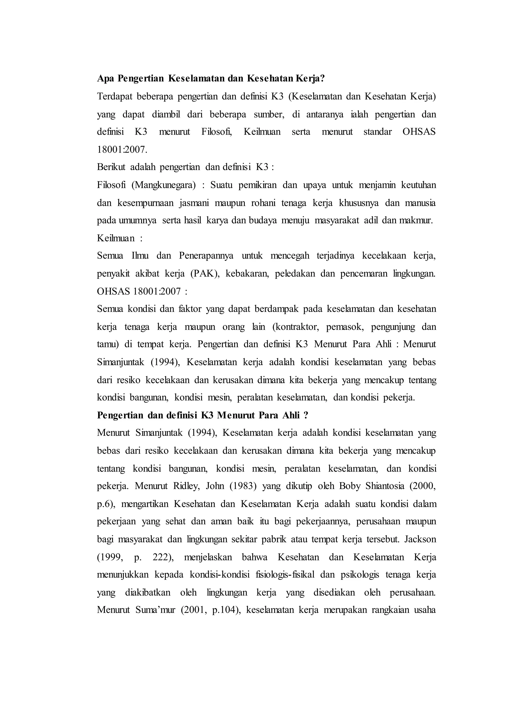 K3 bertujuan melindungi kesehatan dan keselamatan kerja. Pengertiannya meliputi pencegahan kecelakaan, penyakit, dan pencemaran lingkungan di tempat kerja serta perlindungan terhadap risiko kesehatan dan keselamatan bagi pekerja dan orang lain di lingkungan tersebut. Penilaian risiko bertujuan mengidentifikasi bahaya di tempat kerja dan mengambil tindakan untuk mencegah atau mengurangi risikonya.
