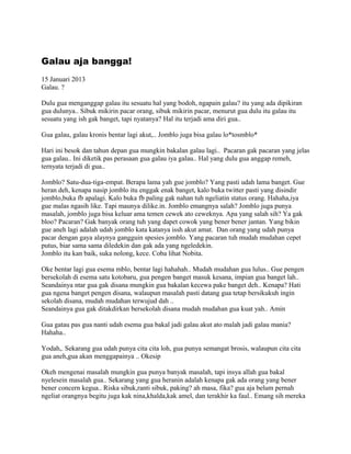 Dokumen ini mencerminkan pengalaman penulis yang merasa galau dan jomblo, menggambarkan tekanan sosial yang dihadapi anak muda serta refleksi tentang arti hidup. Penulis mengungkapkan kekhawatiran tentang nasib jomblo dan harapannya untuk masa depan, sembari merenungkan pentingnya taat kepada Tuhan dan berkontribusi positif di masyarakat. Selain itu, ada kritikan terhadap korupsi dan kesalahan yang dilakukan oleh negara, serta dorongan untuk generasi muda agar tidak terjebak dalam keburukan.