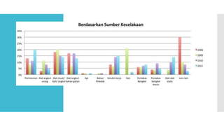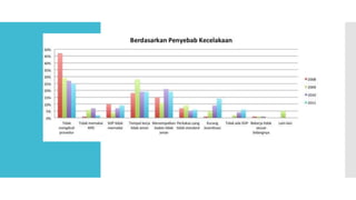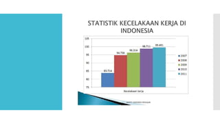 Dokumen ini membahas kecelakaan kerja dan upaya penanggulangannya, menekankan pentingnya keselamatan dan kesehatan kerja untuk mencegah kecelakaan dan penyakit akibat kerja. Penyebab utama kecelakaan kerja adalah perilaku dan kondisi lingkungan yang tidak aman, dengan berbagai jenis kecelakaan tergantung pada sektor industri. Upaya pencegahan meliputi pengendalian ancaman, penggunaan alat pelindung, dan pendidikan kesehatan kerja untuk menciptakan lingkungan kerja yang sehat.