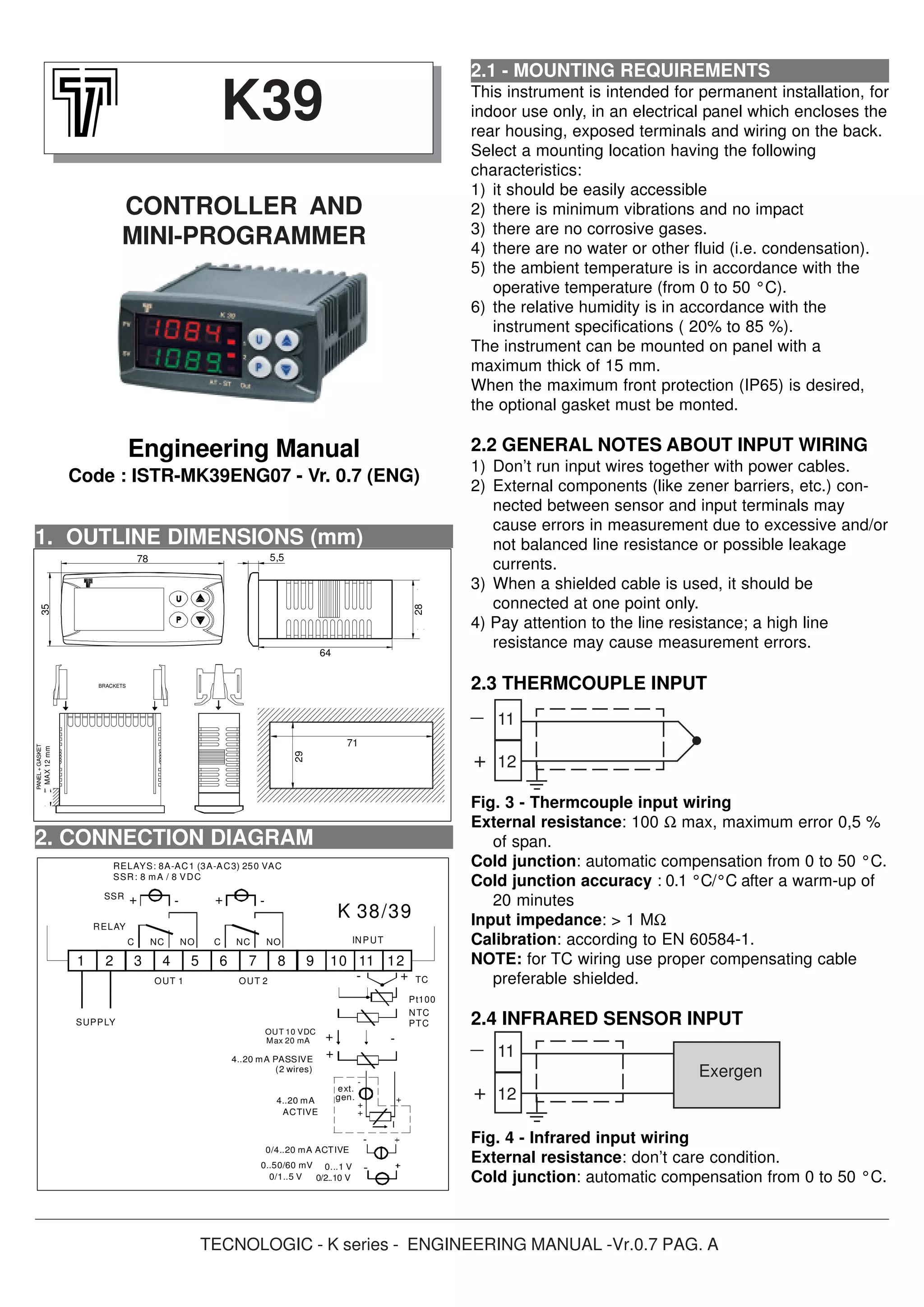 [1] The document provides installation and wiring instructions for TECNOLOGIC K series temperature controllers.