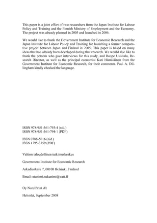 This document compares employment policies in Japan and Finland as they both face rapidly ageing populations. It begins by outlining the economic context and population demographics in each country. Japan's population is ageing more rapidly and its economy is larger, while Finland's economy has grown faster recently. Both countries face challenges in balancing the cohorts leaving versus entering the labor market. The document then reviews each country's employment policies focusing on the elderly and youth. It finds that while Japan is further along in ageing, Finland is more prepared. Key differences and similarities are discussed. Overall, the document provides a high-level overview and comparison of employment policy approaches in Japan and Finland in addressing their common challenge of population ageing.