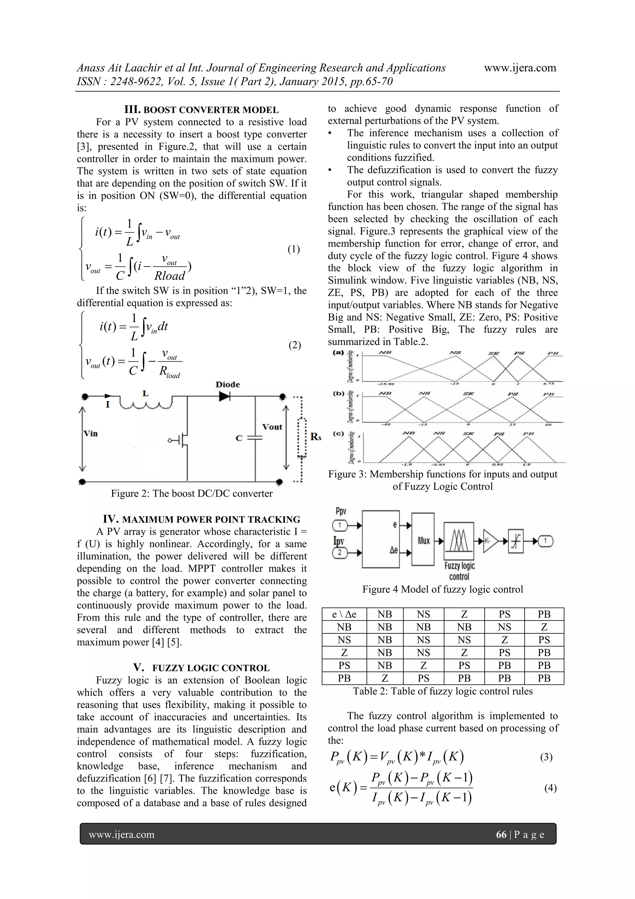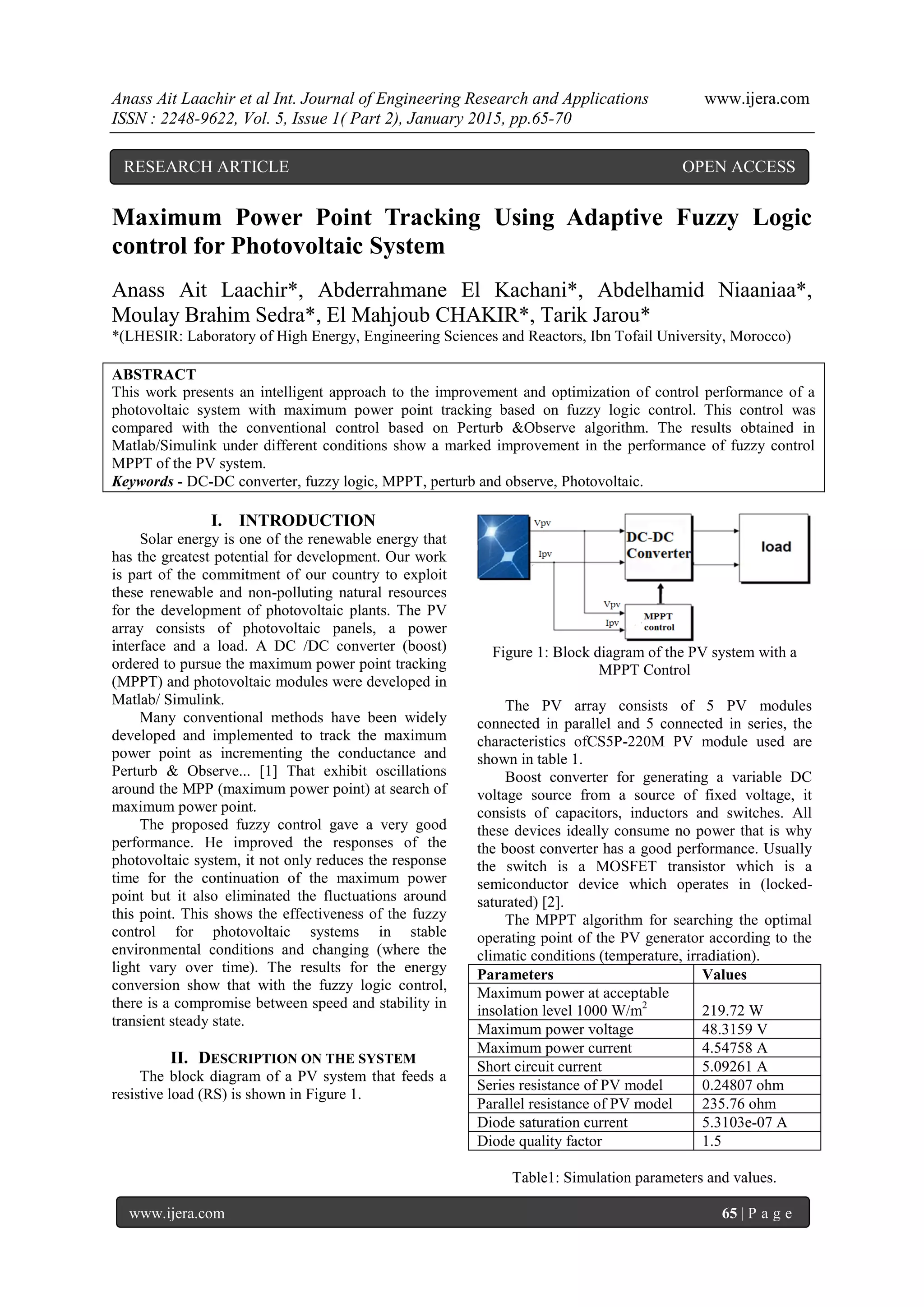 The document presents a study on improving photovoltaic (PV) system performance using maximum power point tracking (MPPT) through adaptive fuzzy logic control. Compared to conventional methods like the perturb & observe algorithm, fuzzy logic significantly enhances the response time and stability, eliminating fluctuations common in varying light conditions. Simulation results demonstrate that the fuzzy control offers faster and more reliable power tracking, confirming its robustness under changing environmental circumstances.