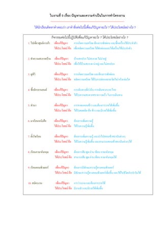 ปัญหาและความจาเป็นในการทาโครงงาน ----------------------------------------------------------------------------- ให้นักเรียนคิดหาคาตอบว่า เราทาสิ่งต่อไปนี้เพื่อแก้ปัญหาอะไร ? ได้ประโยชน์อย่างไร ? กิจกรรมต่อไปนี้ปฏิบัติเพื่อแก้ปัญหาอะไร ? ได้ประโยชน์อย่างไร ? 1. ไปเที่ยวศูนย์การค้า เพื่อแก้ปัญหา การเกิดความเครียด ต้องการพักผ่อน และซื้อเครื่องใช้ประจาตัว ได้ประโยชน์ คือ เพื่อขจัดความเครียด ได้พักผ่อนและได้เครื่องใช้ประจาตัว 2. ทาความสะอาดบ้าน เพื่อแก้ปัญหา บ้านสกปรก ไม่สะอาด ไม่น่าอยู่ ได้ประโยชน์ คือ เพื่อให้บ้านสะอาด น่าอยู่ และไม่สกปรก 3. ดูทีวี เพื่อแก้ปัญหา การเกิดความเครียด และต้องการพักผ่อน ได้ประโยชน์ คือ ขจัดความเครียด ได้รับการผ่อนคลาย จิตใจร่าเริงแจ่มใส 4. ซื้อจักรยานยนต์ เพื่อแก้ปัญหา การเดินทางที่เร่งรีบ การเดินทางระยะไกล ได้ประโยชน์ คือ ได้รับความสะดวกสบาย รวดเร็ว ในการเดินทาง 5. ทานา เพื่อแก้ปัญหา การขาดแคลนข้าว และต้องการรายได้เพิ่มขึ้น ได้ประโยชน์ คือ ได้รับผลผลิต คือ ข้าว และมีรายได้เพิ่มขึน ้ 6. มาเรียนหนังสือ เพื่อแก้ปัญหา ต้องการเพิ่มความรู้ ได้ประโยชน์ คือ ได้รับความรู้เพิ่มขึ้น 7. ตั้งใจเรียน เพื่อแก้ปัญหา ต้องการเพิ่มความรู้ และนาไปสอบเข้าสถาบันต่างๆ ได้ประโยชน์ คือ ได้รับความรู้เพิ่มขึ้น และสามารถสอบเข้าสถาบันต่างๆได้ 8. เรียนภาษาอังกฤษ เพื่อแก้ปัญหา ต้องการฟัง พูด อ่าน เขียน ภาษาอังกฤษ ได้ประโยชน์ คือ สามารถฟัง พูด อ่าน เขียน ภาษาอังกฤษได้ 9. เรียนคอมพิวเตอร์ เพื่อแก้ปัญหา ต้องการมีทักษะความรู้ทางคอมพิวเตอร์ ได้ประโยชน์ คือ มีทักษะความรู้ทางคอมพิวเตอร์เพิ่มขึ้น และใช้ในชีวิตประจาวันได้ 10. สมัครงาน เพื่อแก้ปัญหา การว่างงาน และต้องการรายได้ ได้ประโยชน์ คือ มีงานทา และมีรายได้เพิ่มขึน ้