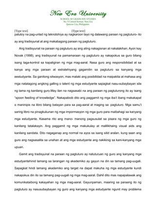 Tinutukoy ng dokumento ang kahalagahan ng pagtuturo sa pagkatuto ng mga estudyante, na nakasalalay sa istilo at pamamaraan ng guro. Ipinapahayag ang pagkakaiba ng tradisyunal at makabagong paraan ng pagtuturo, kung saan ang modernong pamamaraan ay naglalayong mas matugunan ang pangangailangan ng mga mag-aaral sa makabagong teknolohiya. Ang layunin ng pag-aaral ay ihambing ang epektibidad ng dalawang pamamaraan sa pagtuturo ng Filipino sa Grade 7 ng Fortune High School.