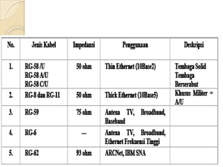 Dokumen tersebut membahas tiga jenis kabel jaringan utama yaitu UTP, koaksial, dan serat optik. UTP dan koaksial memiliki kecepatan hingga 100 Mbps tetapi rentan terhadap gangguan, sedangkan serat optik mampu kecepatan tinggi, jarak jauh, dan tahan gangguan meskipun lebih mahal.