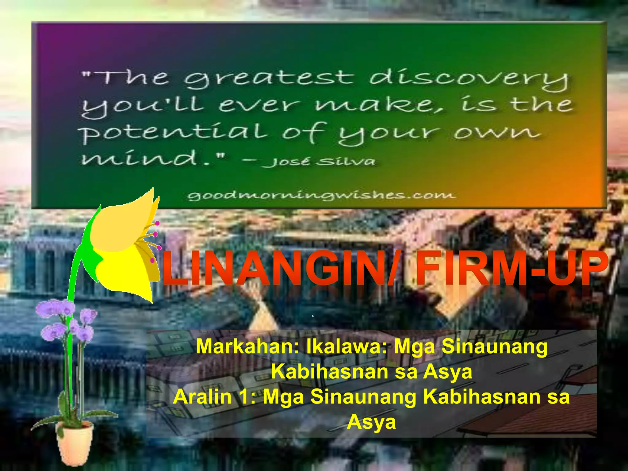 Ang dokumento ay tumatalakay sa mga sinaunang kabihasnan sa Asya, partikular ang Sumer at Indus, na naglalaman ng impormasyon tungkol sa kanilang heograpiya, sistemang pampulitika, ekonomiya, relihiyon, at lipunan. Tinalakay din ang mga ambag ng Sumer sa kabihasnang pandaigdig tulad ng cuneiform at metalurhiya ng bronze, pati na rin ang mga dahilan ng kanilang pagbagsak. Ang kabihasnang Indus ay sinuri rin sa konteksto ng kanilang organisadong pamahalaan at mga sanhi ng kanilang paglaho.