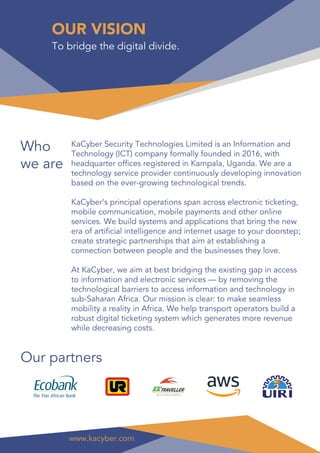Kacyber Security Technologies Limited, founded in 2016 in Kampala, Uganda, provides innovative digital ticketing solutions for transport operators, enhancing revenue while reducing costs. The company specializes in electronic ticketing, mobile communications, and online services to improve access to transportation across Sub-Saharan Africa. Kacyber aims to bridge the digital divide with products like mobile apps, a web portal for ticket purchasing, and a unified management system for customer loyalty.