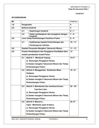 Dokumen ini membahas mengenai pemarkahan tugasan tentang ekspresi kreativiti kanak-kanak melalui seni lukis, dengan mengemukakan lima aktiviti yang mengikut teori perkembangan kreativiti Fisher. Ia menekankan pentingnya kreativiti dalam pendidikan awal kanak-kanak dan bagaimana ia dapat dibangkitkan melalui aktiviti seni. Tambahan pula, dokumen ini menyediakan rancangan pengajaran harian dan soal-soalan berdasarkan taksonomi Bloom untuk membantu pengajaran dan pembelajaran.