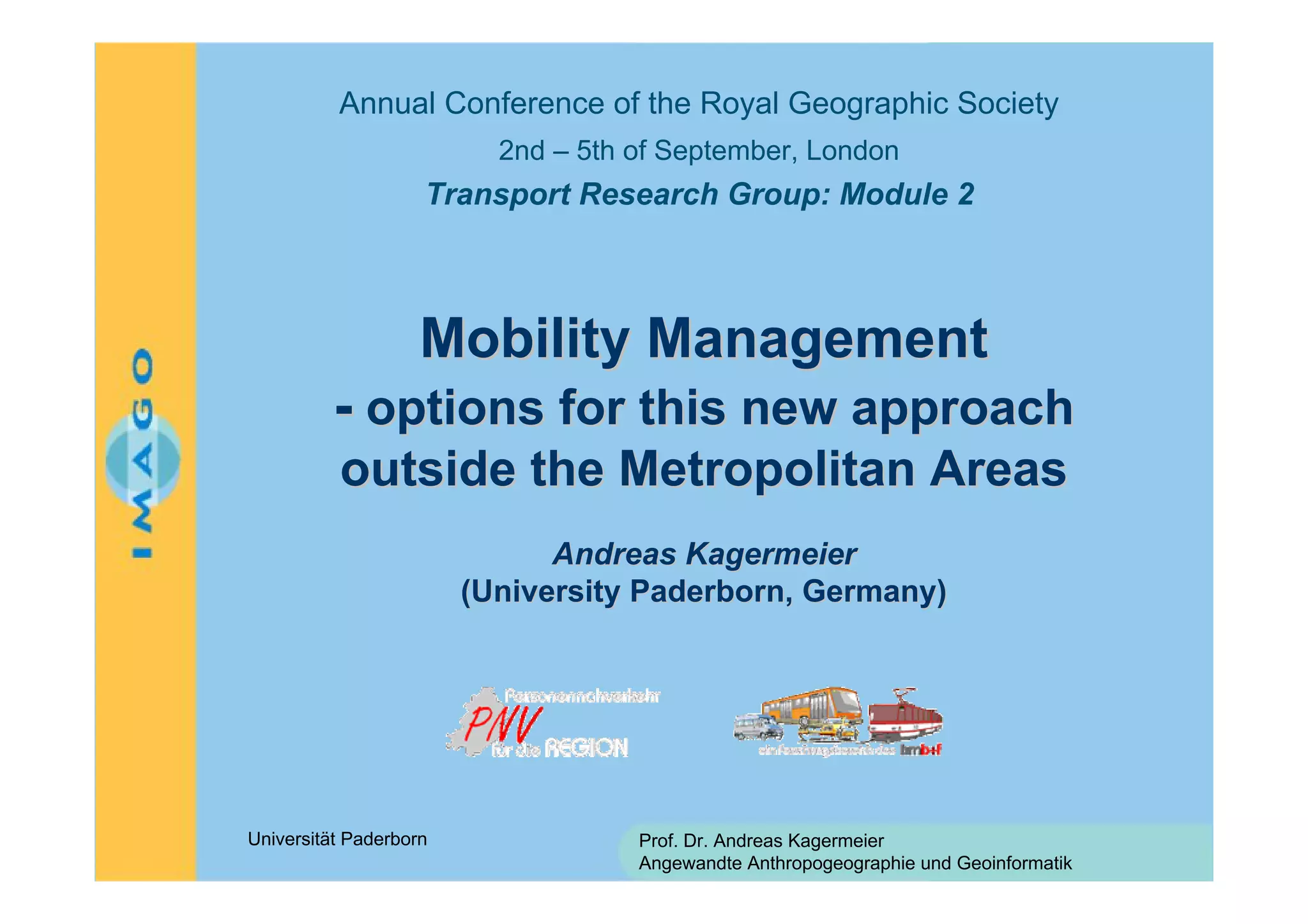 The document summarizes a presentation given by Professor Andreas Kagermeier on options for mobility management outside of metropolitan areas. Mobility management aims to encourage more sustainable transportation choices through soft measures like information and coordination. In rural areas, challenges include low population densities, lack of public transportation alternatives, and insufficient funding. Potential solutions proposed include mobility centers that provide transportation scheduling and booking through information technology, and multi-service centers integrated with other local services like banking. Developing effective solutions for rural areas requires creative, customized approaches to address local constraints.