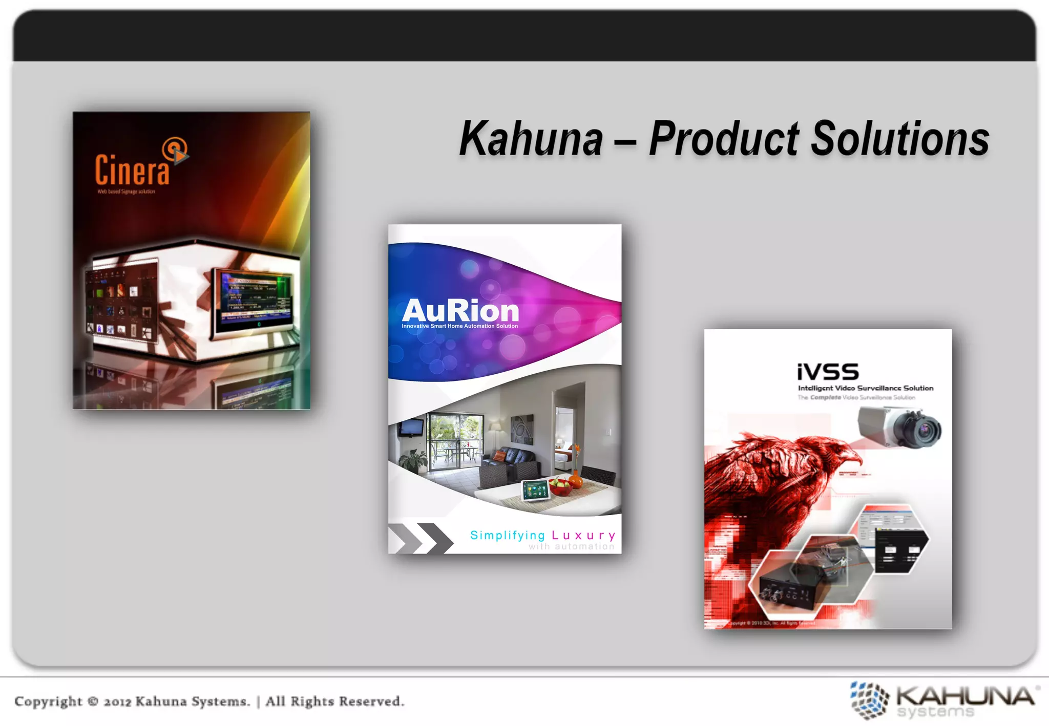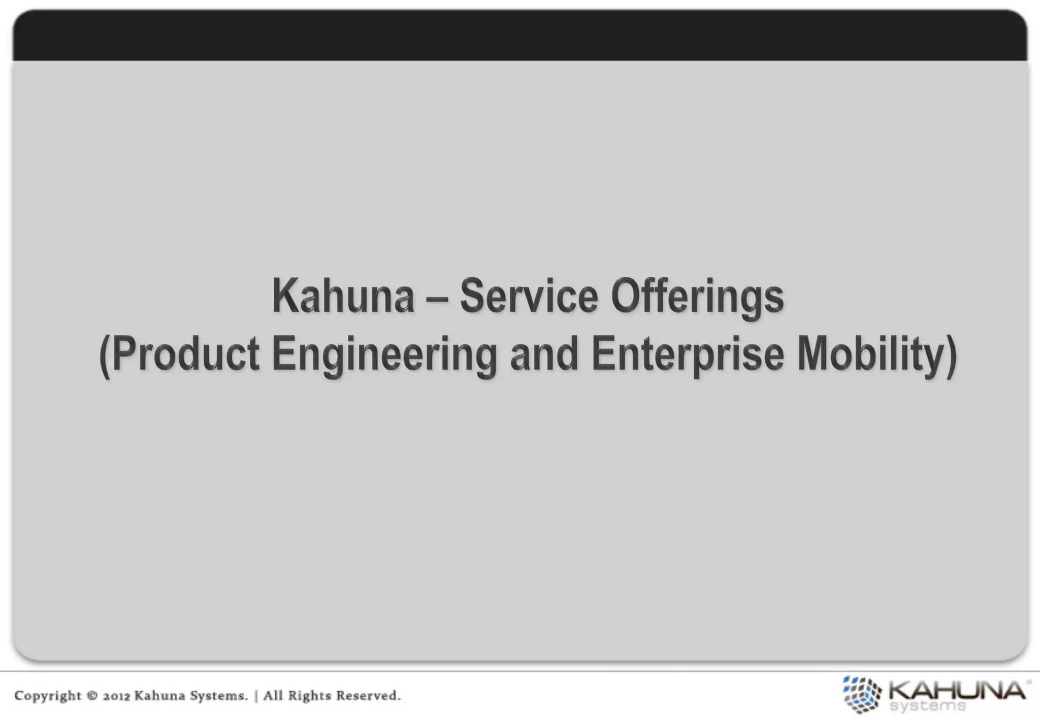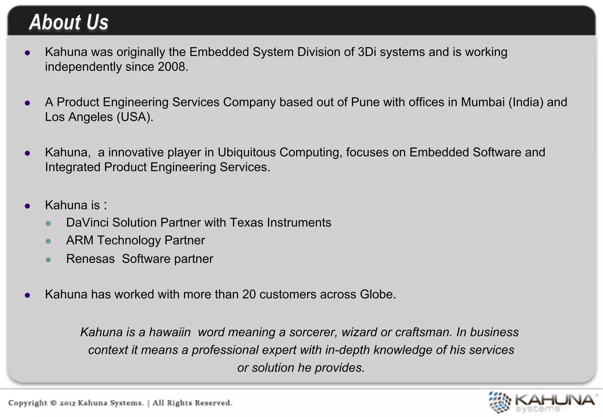 Kahuna provides embedded software and integrated product engineering services. It focuses on areas like ubiquitous computing, embedded software, and product engineering. Kahuna has experience developing solutions for industries like industrial automation, smart grids, multimedia, automotive, consumer electronics, and mobile computing. It utilizes in-house technology frameworks and follows a product-centric services approach to provide value at each stage of product development.