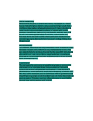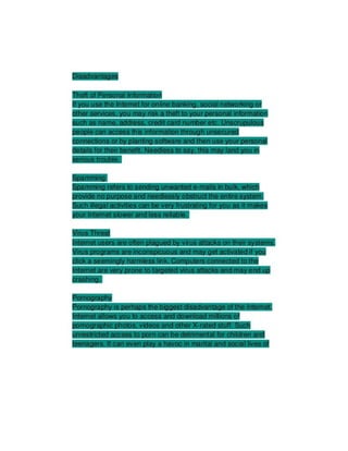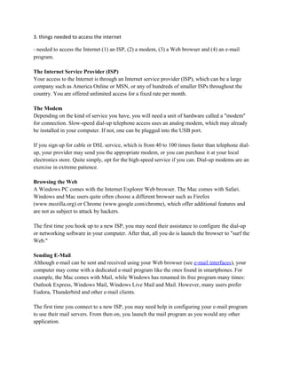 The document discusses computer internet and how to access it. It explains that an internet connection requires an internet service provider (ISP), a modem, a web browser, and an email program. It describes how dial-up and broadband modems work and some popular web browsers and email clients. It also covers topics like switching ISPs, registering a domain name, and using an alternate email provider when changing internet access.
