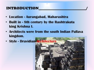 The Kailasa Temple is a 8th century monolithic temple carved out of rock in Aurangabad, India. It was commissioned by King Krishna I and built in the Dravidian architecture style. The temple was carved out of a single rock formation, removing around 400,000 tons of rock. It is one of the largest monolithic structures in the world and was designated a UNESCO World Heritage site in 1983 for its architectural and artistic achievements.