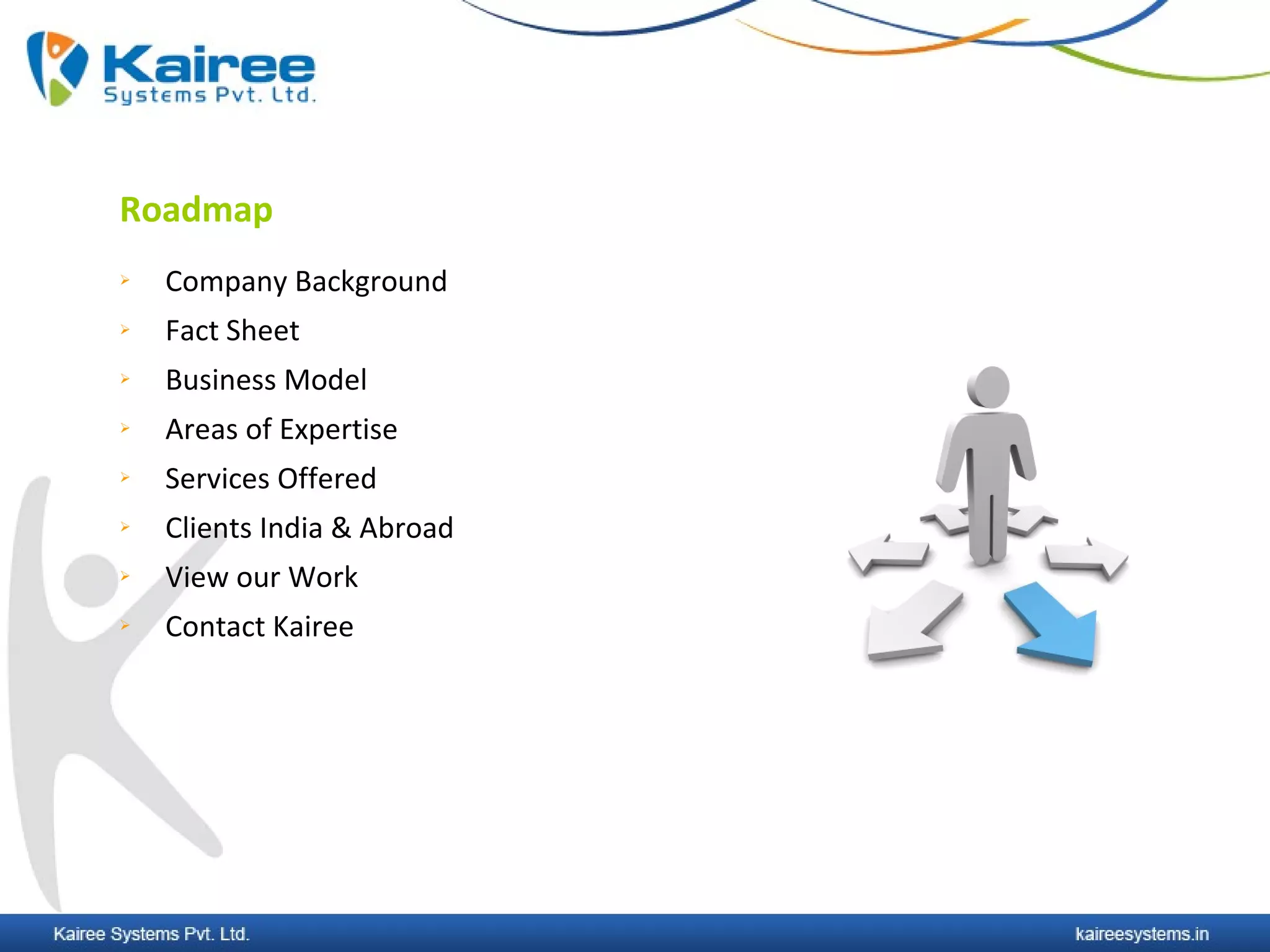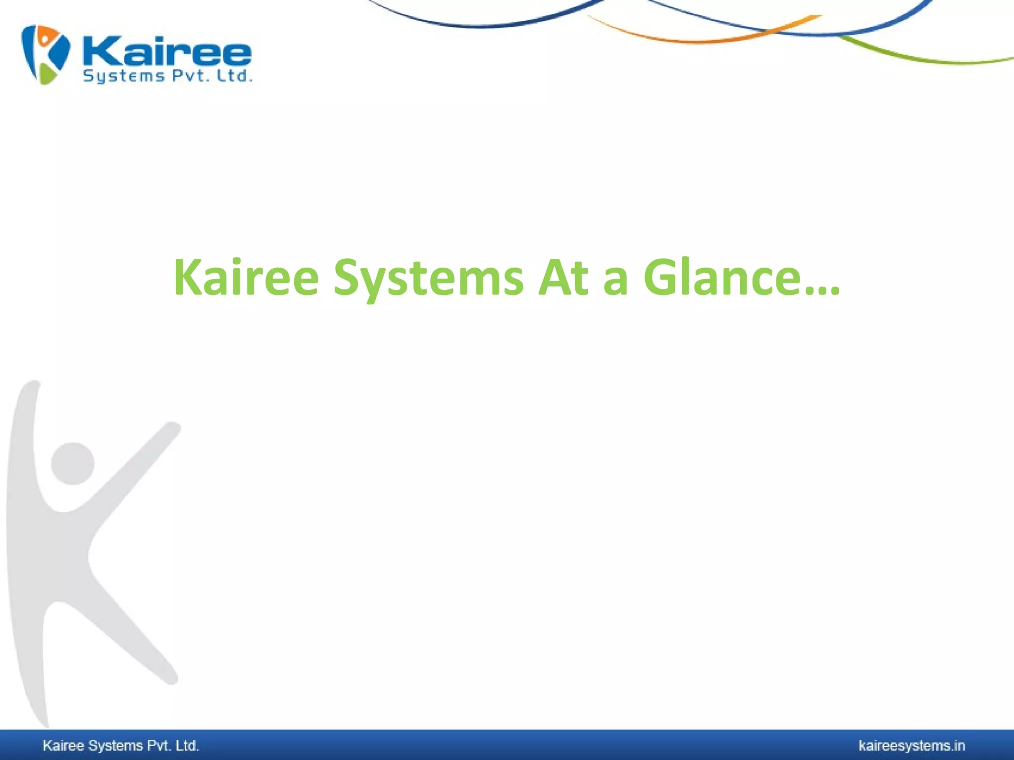 Kairee Systems provides software development and document management services. It has over 45 employees and is ISO 9001 certified. It develops solutions for industries like manufacturing, telecom, and services. Kairee follows agile development processes and ensures client satisfaction through project management and support. It has experience developing e-commerce sites, enterprise applications, and specialized systems for clients in India and abroad.