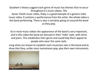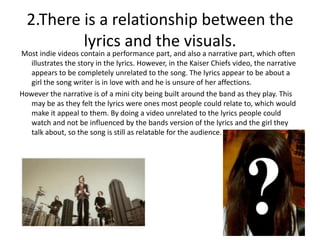 The Kaiser Chiefs music video for "Ruby" is an example of a generic indie music video. It contains both a performance element, showing the band playing their instruments, and a narrative element where a miniature city is built around the band as they perform. Close-ups of each band member are used to establish their roles and allow the audience to recognize them, helping promote their music. The video focuses equally on the performance and unrelated narrative elements.