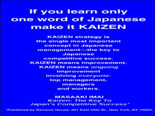 The document introduces the concept of Kaizen, a Japanese philosophy for continuous improvement developed by Masaaki Imai. Kaizen means "change for better" and focuses on making small, incremental changes to improve productivity and minimize waste. The key principles of Kaizen are considering the entire process, not blaming individuals, and implementing the best process. Benefits include reduced waste, improved quality and employee satisfaction. Toyota is recognized as a leader in applying Kaizen methods through widespread employee suggestion programs.