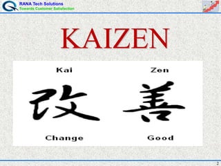 The document discusses the concept of Kaizen, which is a Japanese philosophy of continual improvement. It was introduced by Masaaki Imai and means "change for better". The document outlines the benefits of Kaizen such as identifying waste and improving skills. It describes the seven types of waste as overproduction, waiting, transportation, excess processing, inventory, unnecessary movement, and defects. Additionally, it provides examples of Kaizen and notes that the goal is to establish continual improvement as part of daily work culture.