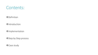 Kaizen is a Japanese philosophy of continuous improvement involving employees at all levels. The document discusses Kaizen and its implementation through a step-by-step process. Kaizen was introduced in Japan after WWII to help rebuild the country and improve management skills. It involves standardizing operations, measuring performance, innovating to meet requirements, and continually repeating the cycle. Kaizen is used extensively in product development to design efficient manufacturing processes. It employs lean thinking and has been shown to reduce costs, space needs, and improve worker satisfaction through its success in pull cellular manufacturing systems.