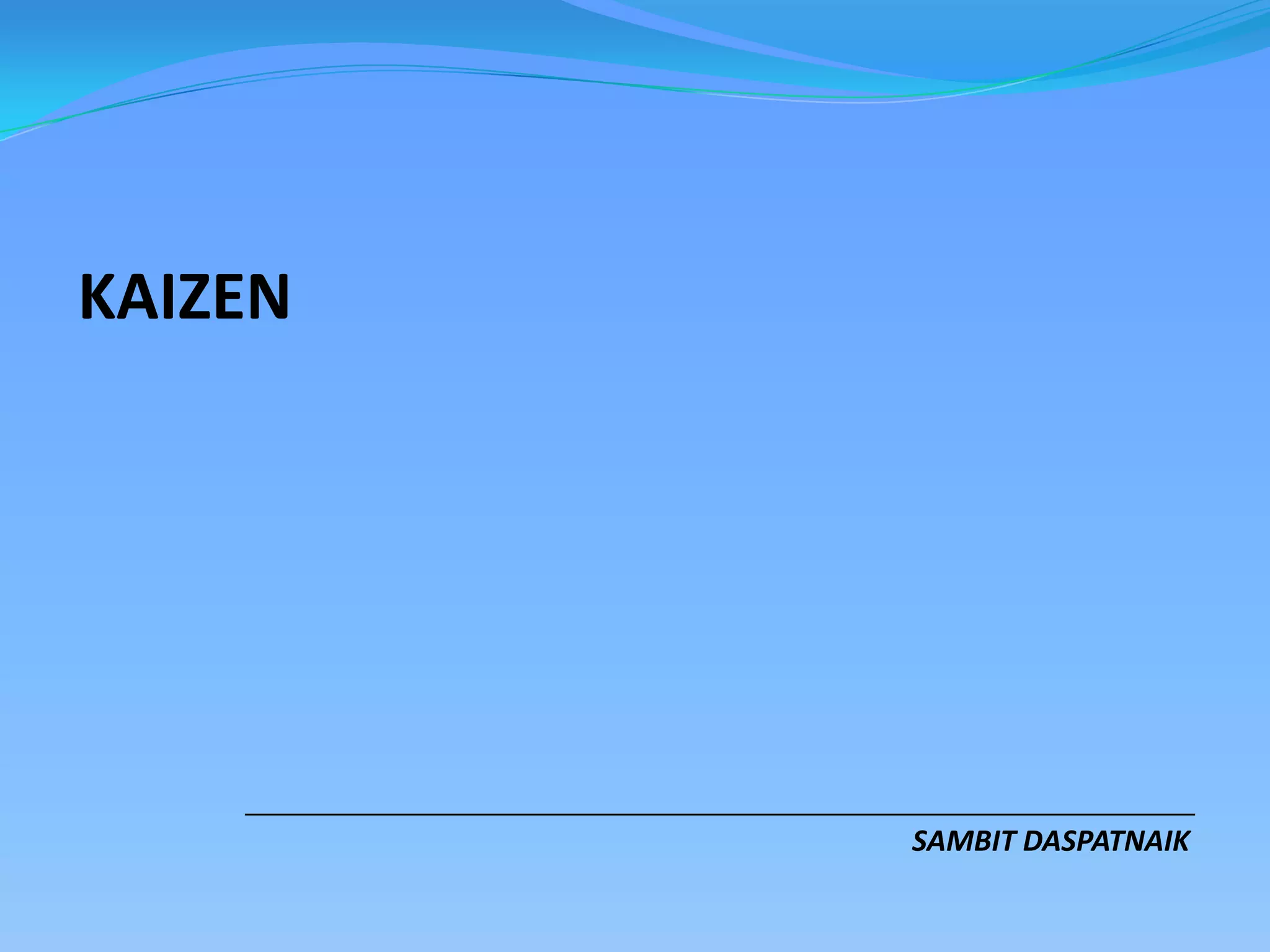 Kaizen is a Japanese management concept for continuous, gradual improvement through small, incremental changes focused on people. It aims to bring long term changes by eliminating waste, implementing good housekeeping practices like the 5S framework of straightening, sorting, sweeping, standardizing and disciplining, and standardizing processes through teamwork, personal discipline, quality circles and employee suggestions.