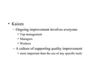 Kaizen refers to ongoing improvement involving everyone in an organization. It emphasizes a culture of supporting quality improvement through problem solving over the use of specific tools. The philosophy and systems behind the Japanese quality movement center around Kaizen. Process-oriented thinking and continuous incremental improvement differ from Western result-oriented and innovation-focused management. Key aspects of Kaizen culture include adopting a customer-driven and collaborative approach to cross-functional problem solving.