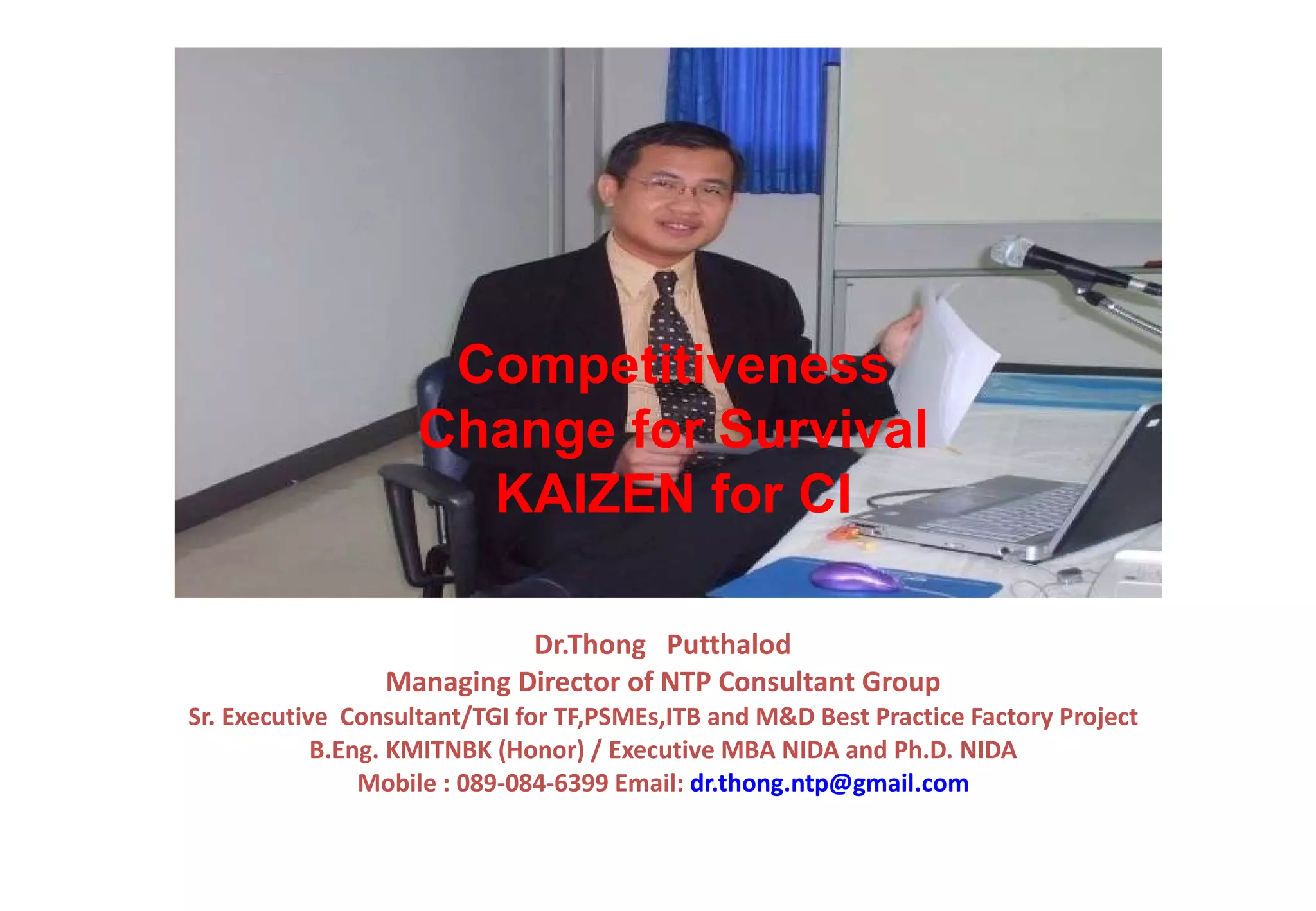Dr.Thong Putthalod Managing Director of NTP Consultant Group Sr. Executive Consultant/TGI for TF,PSMEs,ITB and M&D Best Practice Factory Project B.Eng. KMITNBK (Honor) / Executive MBA NIDA and Ph.D. NIDA Mobile : 089-084-6399 Email: [email_address] Competitiveness Change for Survival KAIZEN for CI