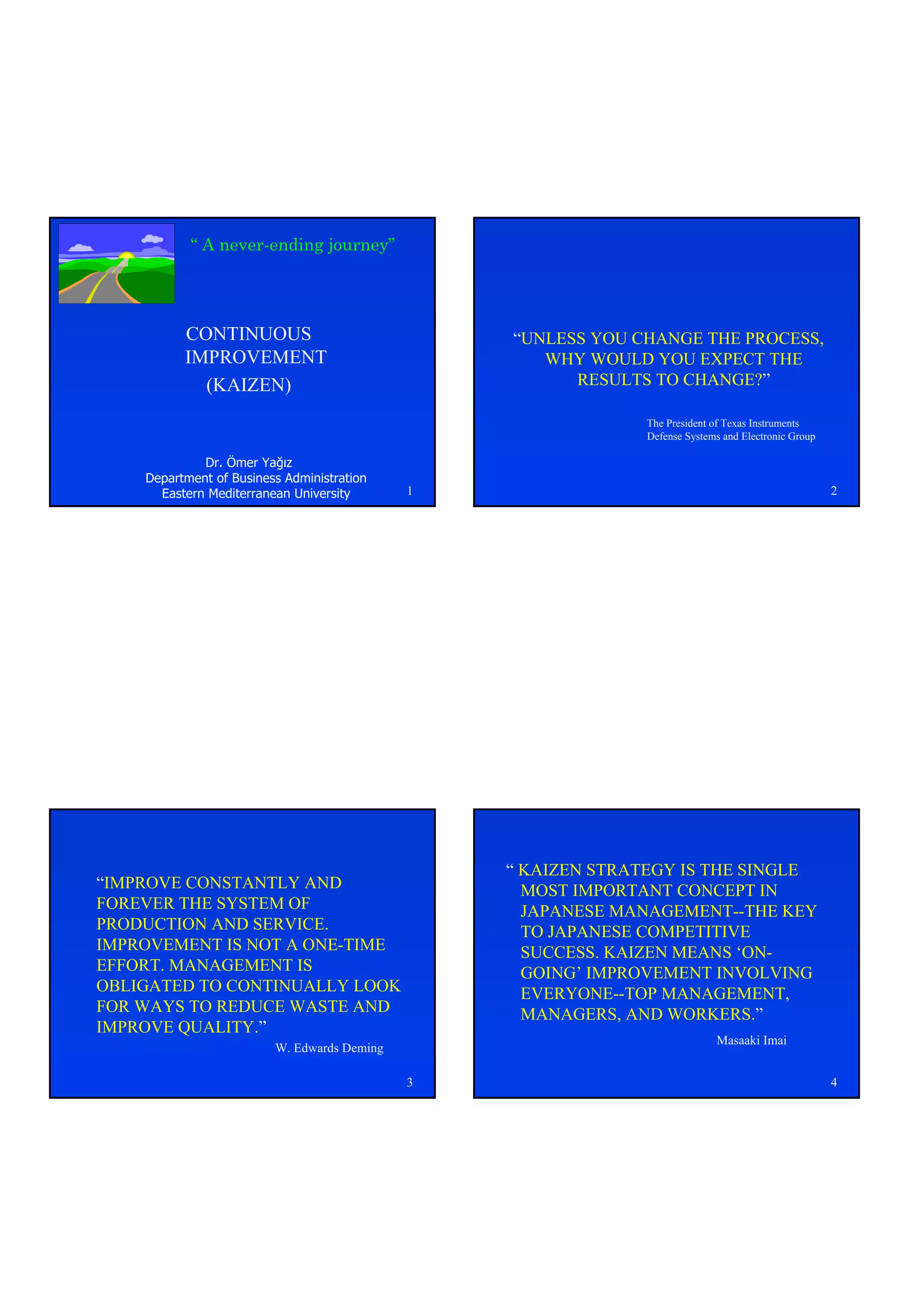 This document discusses the concept of continuous improvement, also known as Kaizen. It explains that Kaizen is a core concept in Japanese management that emphasizes ongoing, incremental improvement involving everyone in an organization. Kaizen focuses on problem identification and aims to improve all processes and aspects of an organization continuously over time through small, ongoing changes. The document provides examples from Motorola to illustrate how Kaizen was applied through ambitious stretch goals to dramatically improve quality.