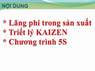 Tài liệu phân tích các loại lãng phí trong sản xuất như sản xuất thừa, khuyết tật, tồn kho và thao tác thừa, đồng thời giới thiệu triết lý Kaizen với 10 nguyên tắc nhằm cải tiến quy trình và hiệu suất làm việc. Kaizen yêu cầu sự cam kết từ mọi cấp độ trong doanh nghiệp và nhấn mạnh vai trò quan trọng của việc cải thiện liên tục để tối đa hóa giá trị khách hàng. Các chương trình 5S được đề xuất như một phương pháp cụ thể để duy trì và cải thiện môi trường làm việc.