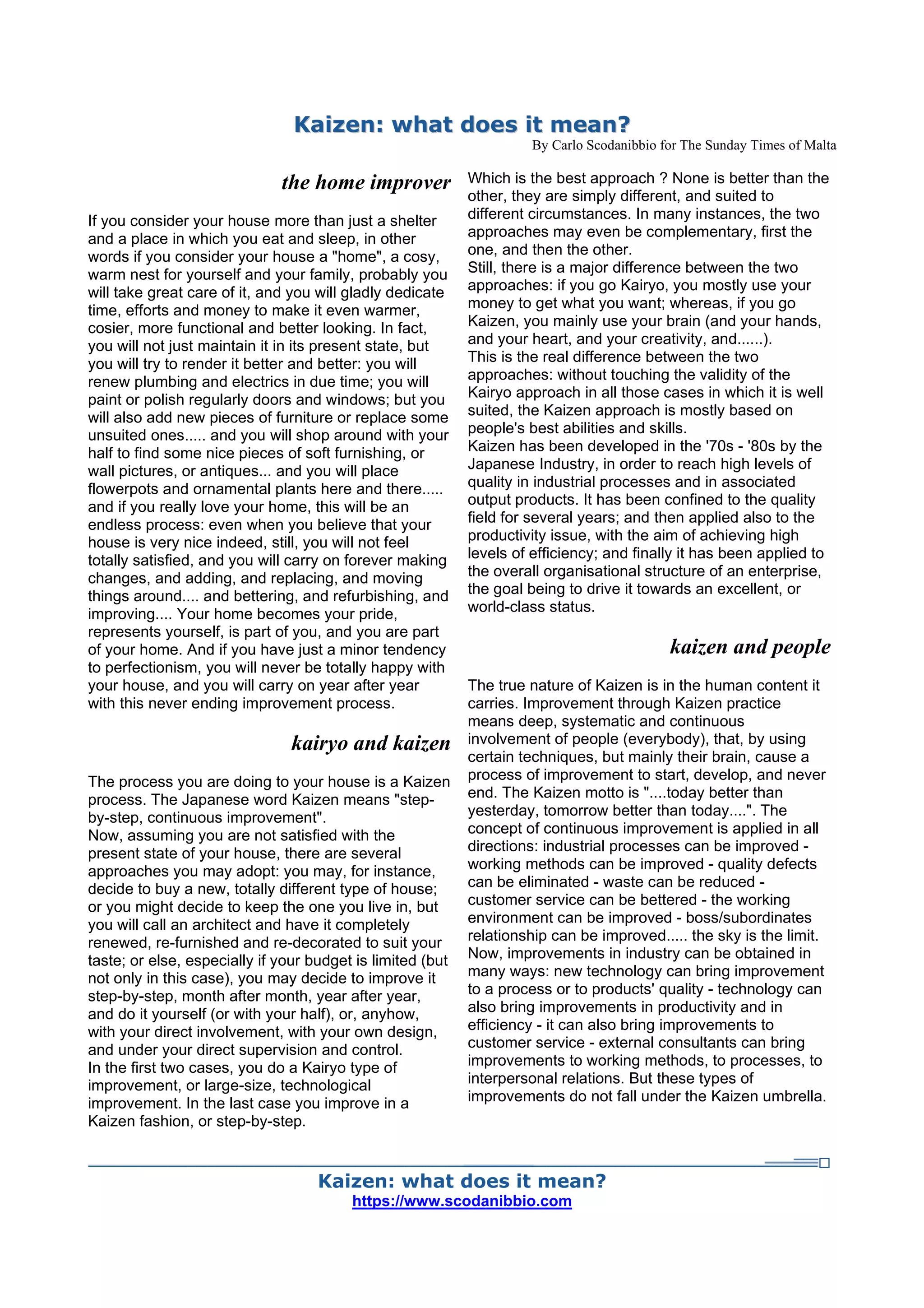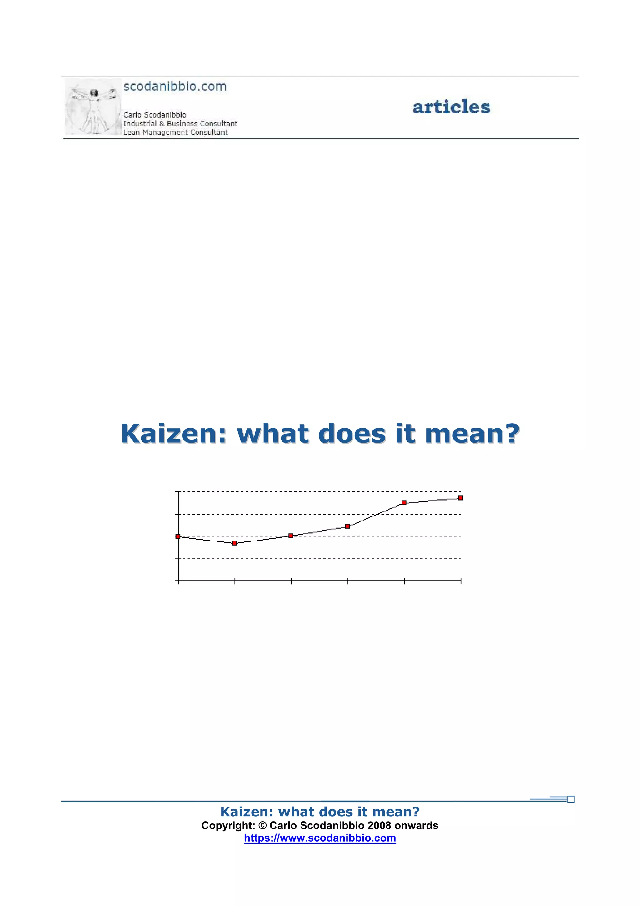 The document discusses the concept of 'kaizen', a Japanese term meaning 'continuous improvement', and its application to home improvement and industrial processes. It contrasts kaizen with 'kairyo', a larger-scale improvement approach, highlighting that kaizen focuses on human creativity and incremental changes rather than financial expenditure. The author emphasizes the importance of teamwork, a shared vision, and personal involvement in successfully implementing kaizen principles in both home and industrial settings.