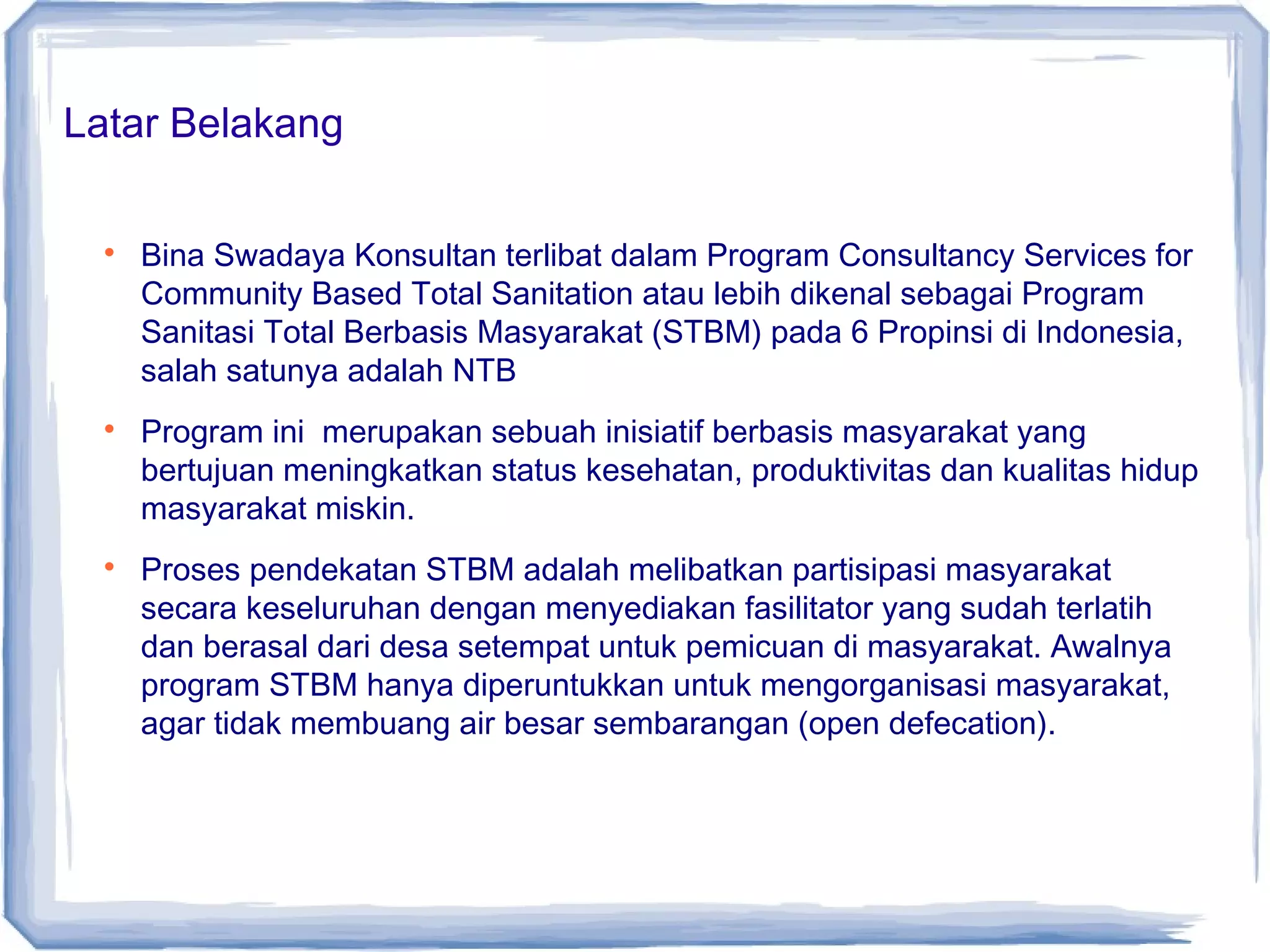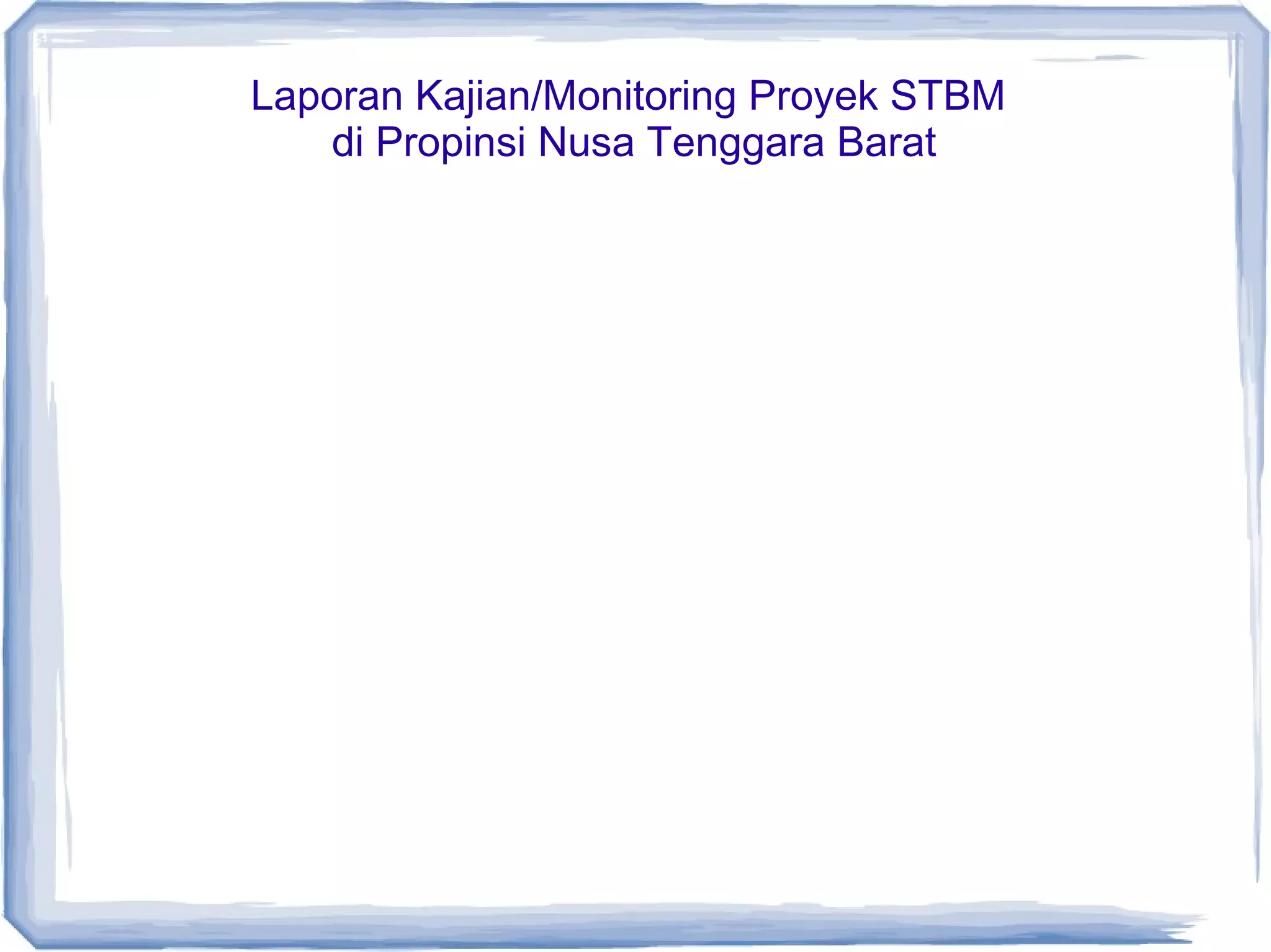 Laporan ini meringkas hasil kunjungan lapangan untuk memonitor proyek Sanitasi Total Berbasis Masyarakat di 5 kabupaten di Nusa Tenggara Barat. Program ini bertujuan meningkatkan kesehatan masyarakat dengan mengurangi buang air besar sembarangan. Laporan ini meninjau konsep, strategi, capaian target, dan tantangan program tersebut di lapangan, serta merekomendasikan advokasi untuk keberlanjutannya.