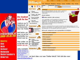 Wat kun jedoen – als het gebeurt? Volg bekende aanpak van (analoog) pesten: bron is hetzelfde Snel handelen (de kop indrukken) & geplaagde serieus nemen Bewijs verzamelen (sms, email, msn, webcam) Blokkeren: op afzender van mail, msn of gsm-nr (sociaal lastig) Contact school & ouders (vertrouwensinspectie (0900-11131113)?) Dader bekend? Gesprek, evt consequenties (niet computeren, GSM afnemen etc) Klassegesprek