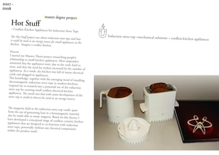 Kajsa Westman developed cordless kitchen appliances powered by induction stove tops for her master's thesis project called "Hot Stuff". She conceptualized a range of appliances like a toaster, kettle, and juicer that would operate within the electromagnetic field of an induction cooktop without needing electrical components inside. Previously, she gained experience through internships at Volkswagen design and Frog Design, as well as a workshop with IKEA designing Swedish-inspired furniture.