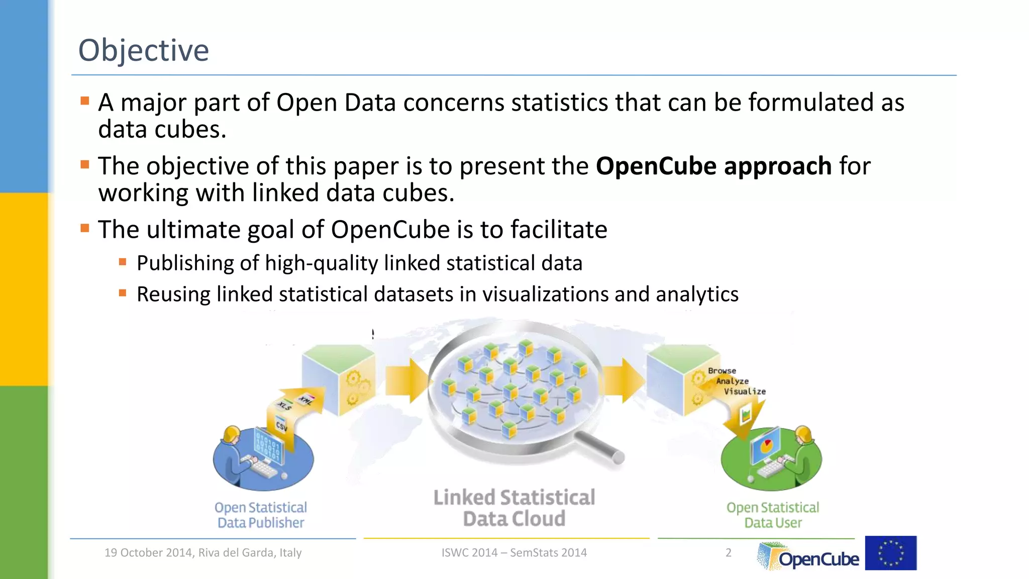 The document discusses the OpenCube approach for working with linked data cubes. OpenCube develops components to support the full lifecycle of linked statistical data, from publishing raw data cubes to consuming them through analytics, visualizations, and other applications. It presents several components that have been implemented, including tools for publishing statistical data in various formats, browsing and visualizing data cubes, and integrating with R for advanced analytics. Initial evaluations of the components have provided insights around publishing and working with large linked statistical datasets.