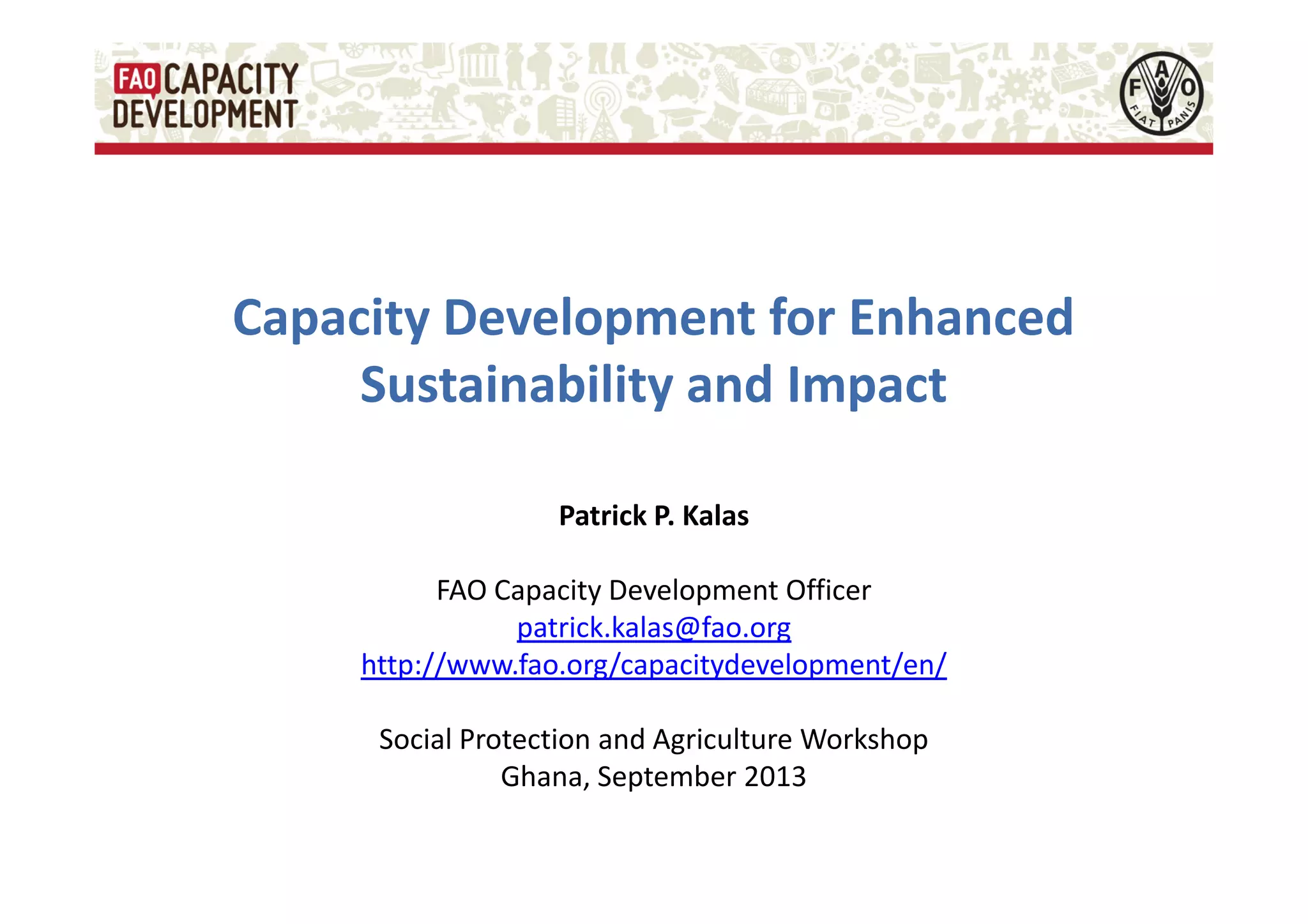 The document discusses capacity development as a process to enhance the ability of individuals, organizations, and societies to manage their affairs effectively, emphasizing the need for a comprehensive approach that goes beyond mere training. It identifies three dimensions of capacity development—individual, organizational, and enabling environment—and highlights the importance of nurturing existing capacities through targeted interventions and local ownership. The FAO's analysis reveals that although many capacity development interventions are relevant, sustainability remains a challenge, necessitating strategic assessments and a focus on collaboration across sectors.