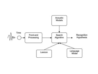 This document provides an overview of automatic speech recognition (ASR) technologies. It discusses the challenges of ASR processing including speaker and language variability as well as noise. It describes pattern-based and statistical approaches to ASR, including hidden Markov models, Gaussian mixture models, and deep neural networks. The document lists some open source and commercial ASR engines and provides steps to build an online ASR system using open source tools like Kaldi, Kaldi gstreamer server, and Dictate.js. It concludes with a live demo of a personal ASR system built with these tools.