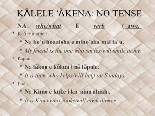 This document provides instruction on using the Hawaiian relative pronoun "na" to form sentences indicating who is performing an action. It covers using "na" with different tenses (past, present, future) and includes examples and contractions. Special cases are discussed when "na" is used with other nouns or pronouns. Questions using "na" are also presented.