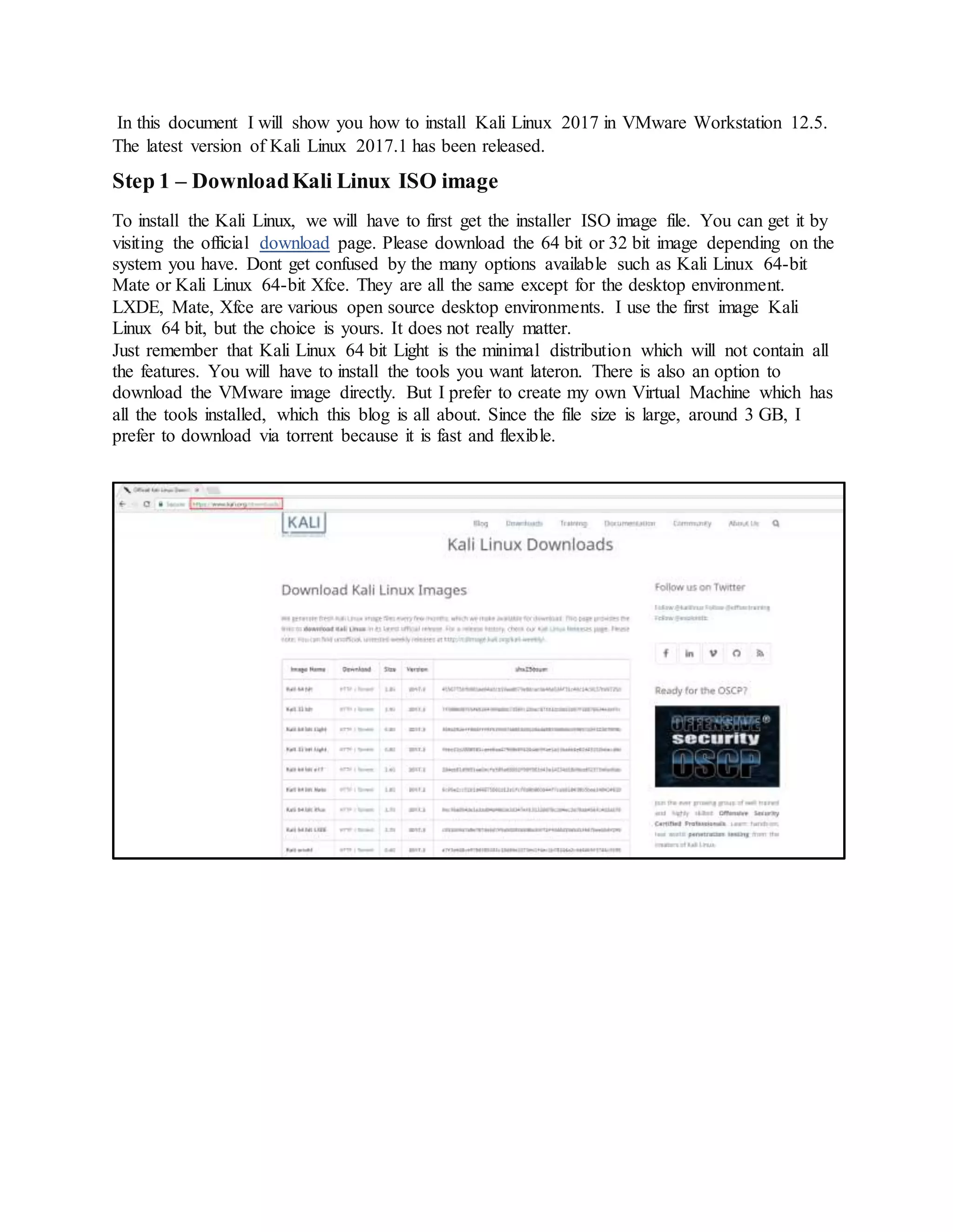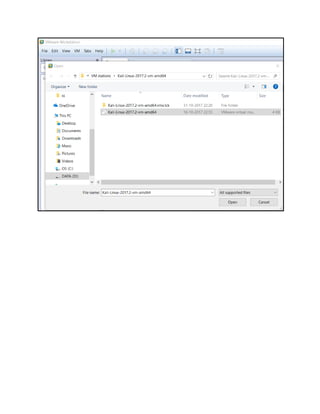 This document provides a step-by-step guide for installing Kali Linux 2017 on VMware Workstation 12.5. It covers downloading the ISO image, creating a new virtual machine, and completing the installation process, including configuration and installation of VMware tools for optimal performance. The document also includes options for downloading custom Kali Linux images and obtaining community support.