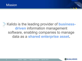 Kalido provides business-driven information management software that enables companies to manage data as a shared enterprise asset and deliver agile data governance across the organization. It offers solutions for master data management, data governance, and industry-specific needs. Kalido prides itself on speed of implementation, low costs, and its ability to easily adapt to changing business needs.