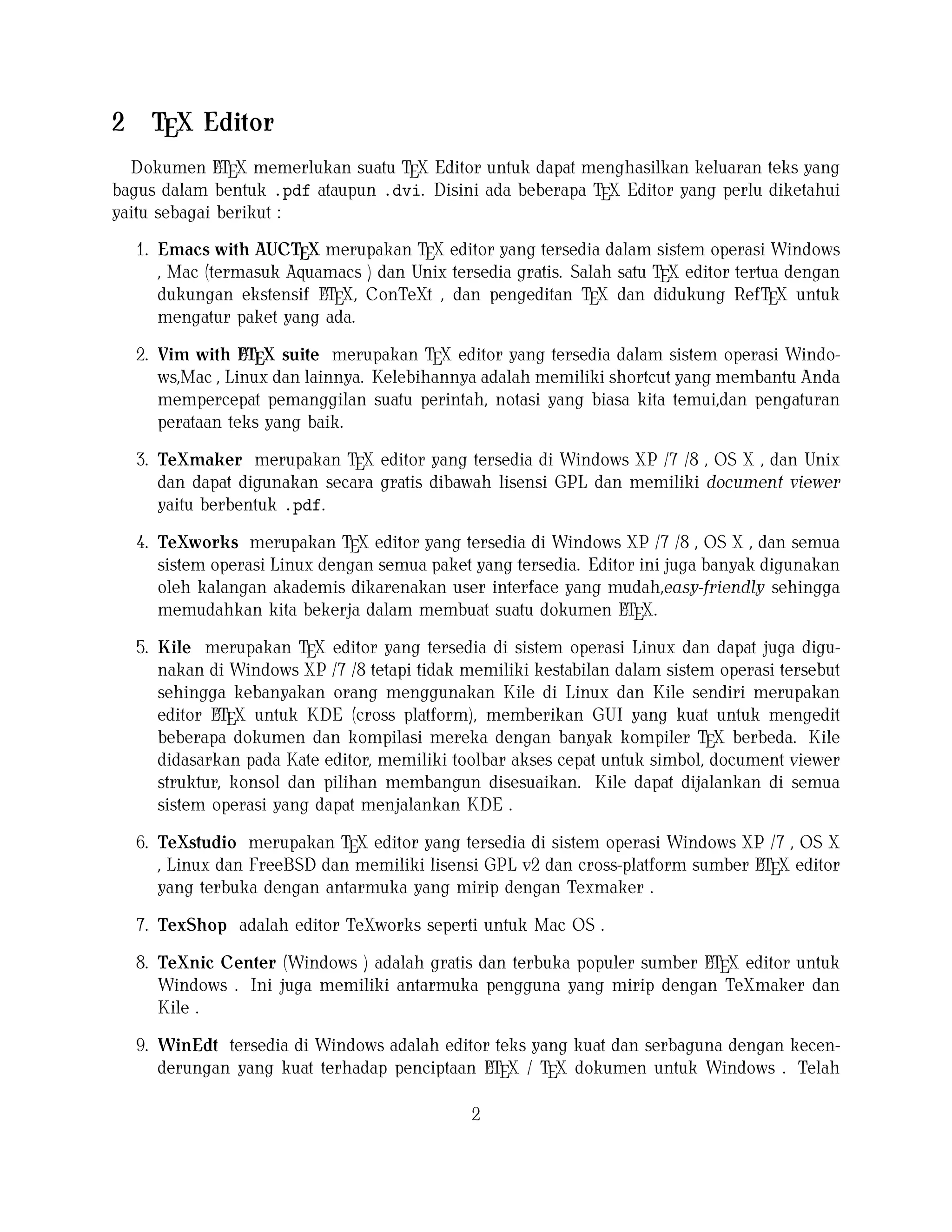 Dokumen tersebut membahas tentang TEX dan LATEX. TEX adalah bahasa pemrograman yang dibuat oleh Donald Knuth untuk menghasilkan dokumen dengan kualitas cetak yang baik khususnya untuk notasi matematika. LATEX adalah sistem pengolah dokumen yang dikembangkan oleh Leslie Lamport berbasis TEX. Dokumen ini juga menjelaskan beberapa editor TEX yang dapat digunakan untuk mengedit dokumen LATEX.