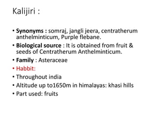 Kalijiri is a plant that grows throughout India, especially in the Himalayas up to 1650 meters. It obtains its properties from the fruits and seeds of the Centratherum Anthelminticum plant. Kalijiri has many medicinal uses such as treating intestinal worms, skin diseases, reducing blood sugar and blood pressure, and helping with weight loss. It also has diuretic, antioxidant, and astringent properties that can help with conditions like diarrhea, ulcers, asthma, coughs, and kidney troubles.