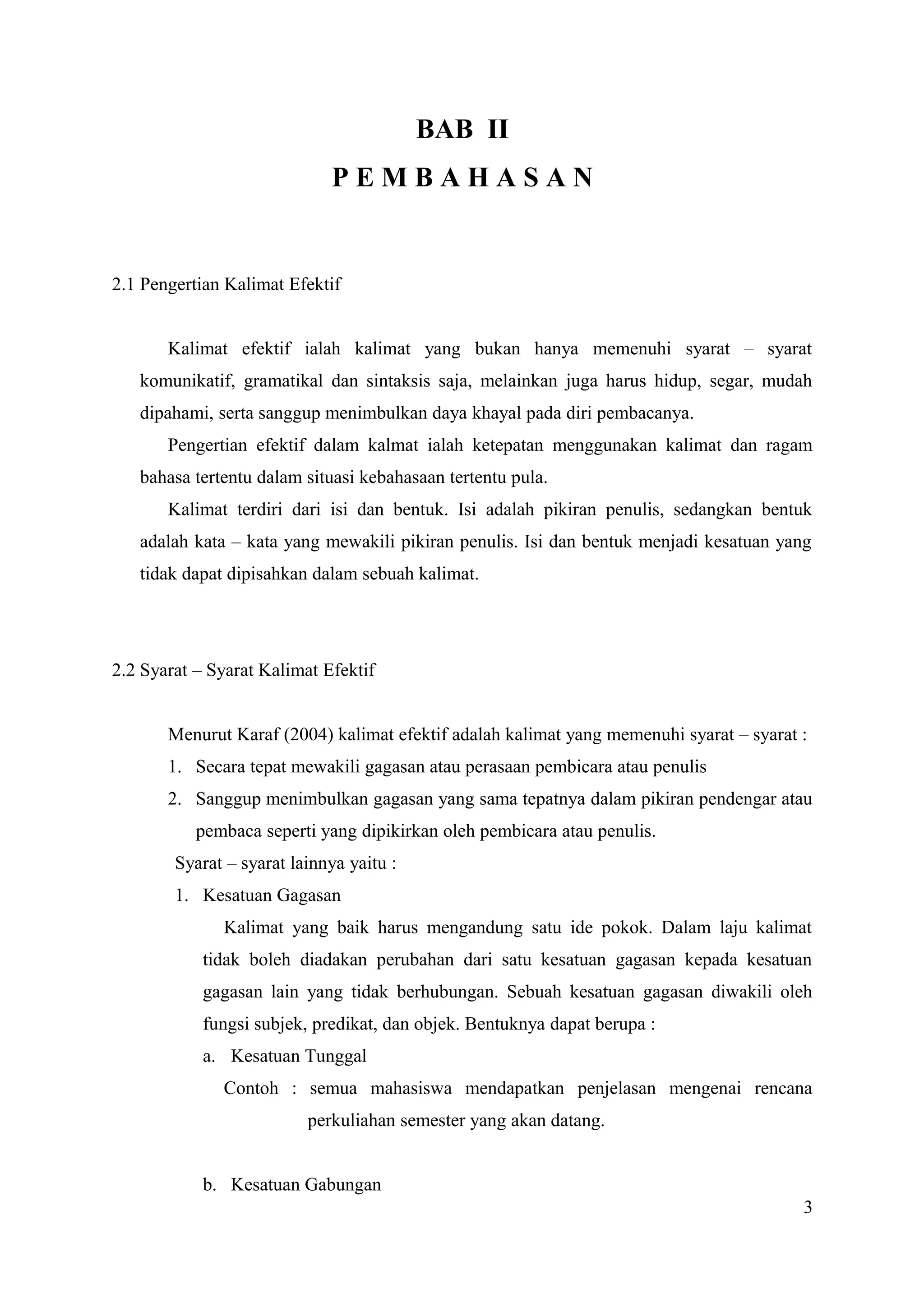 Dokumen tersebut membahas tentang pengertian, syarat-syarat, ciri-ciri, dan unsur-unsur kalimat efektif. Kalimat efektif dijelaskan sebagai kalimat yang memenuhi syarat komunikatif, gramatikal, sintaksis, mudah dipahami, dan mampu menimbulkan imajinasi. Syarat utama kalimat efektif adalah kesatuan gagasan, koherensi, penekanan, variasi, kesejajaran, dan logika.